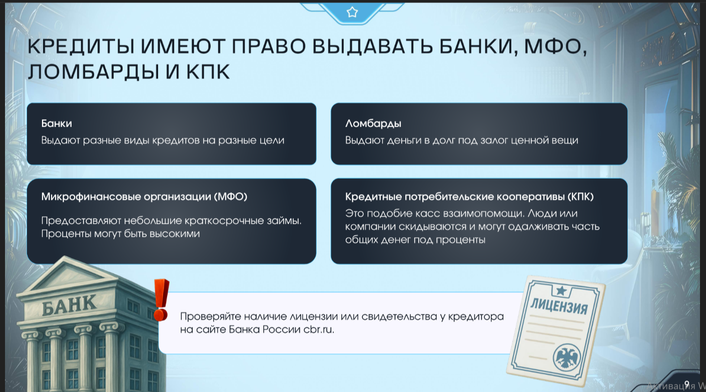Студенты узнали много нового и интересного о видах кредита и о том, кто имеет право выдавать их, о коллекторских агентствах, а также у кого лучше просить деньги в долг. Выделили основные правила, которых следует придерживаться: