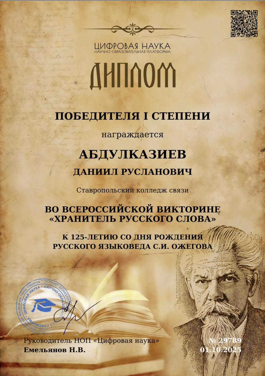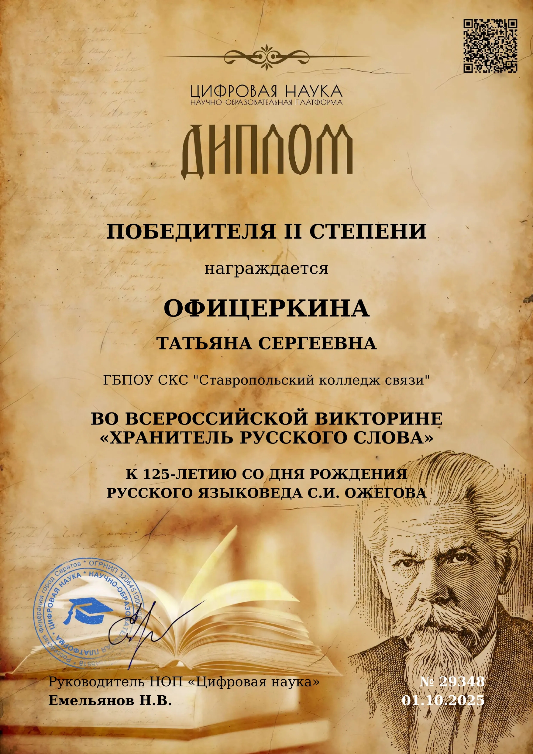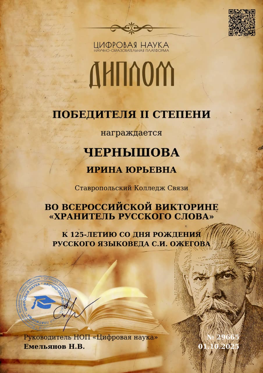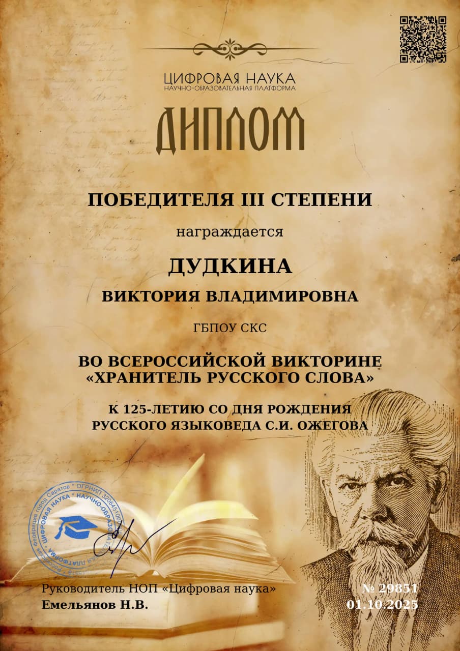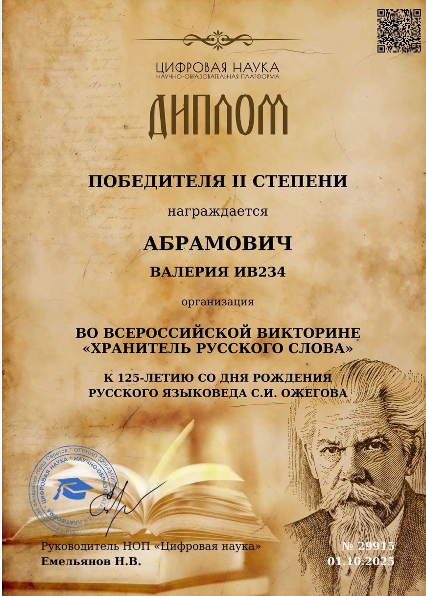Студенты отделения «Информационные системы и программирование» групп ИП 232, ИВ 234, ИВ 244 и классные руководители Татьяна Сергеевна Офицеркина и Виктория Викторовна Дудкина 1 октября приняли активное участие во Всероссийской викторине «Хранитель русского слова», приуроченной к 125-летию со дня рождения выдающегося русского языковеда Сергея Ивановича Ожегова.