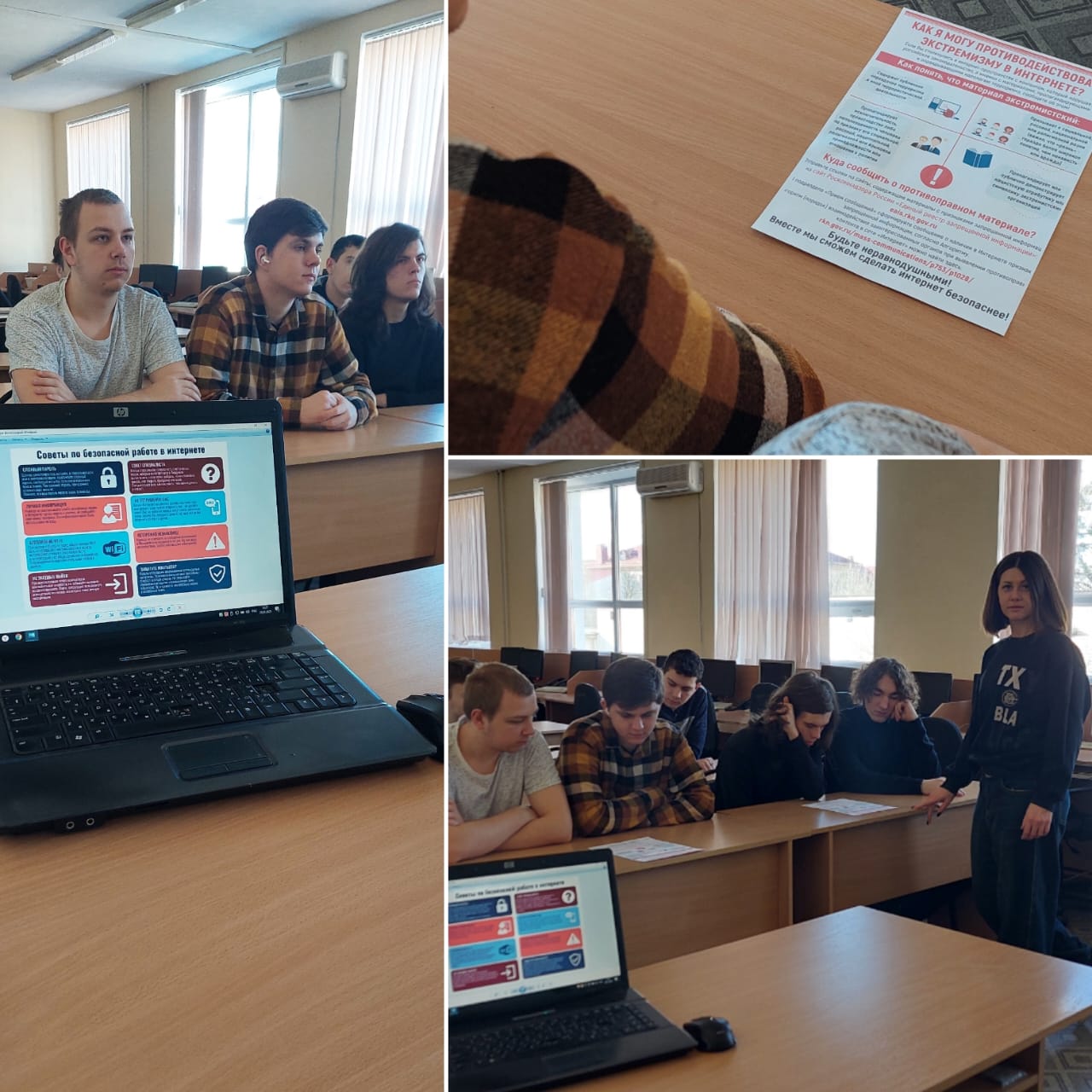 Студенты ежедневно используют цифровые онлайн-платформы для учебы, общения и поиска информации, однако глобальная сеть предопределяет множество рисков и угроз. В целях профилактики и предотвращения возможных последствий в группе ИКС 221 проведена разъяснительная беседа по безопасному использованию интернет-ресурсов, правилам поведения в сети «Интернет», а также о возможных последствиях участия в интернет-группах экстремистской направленности.