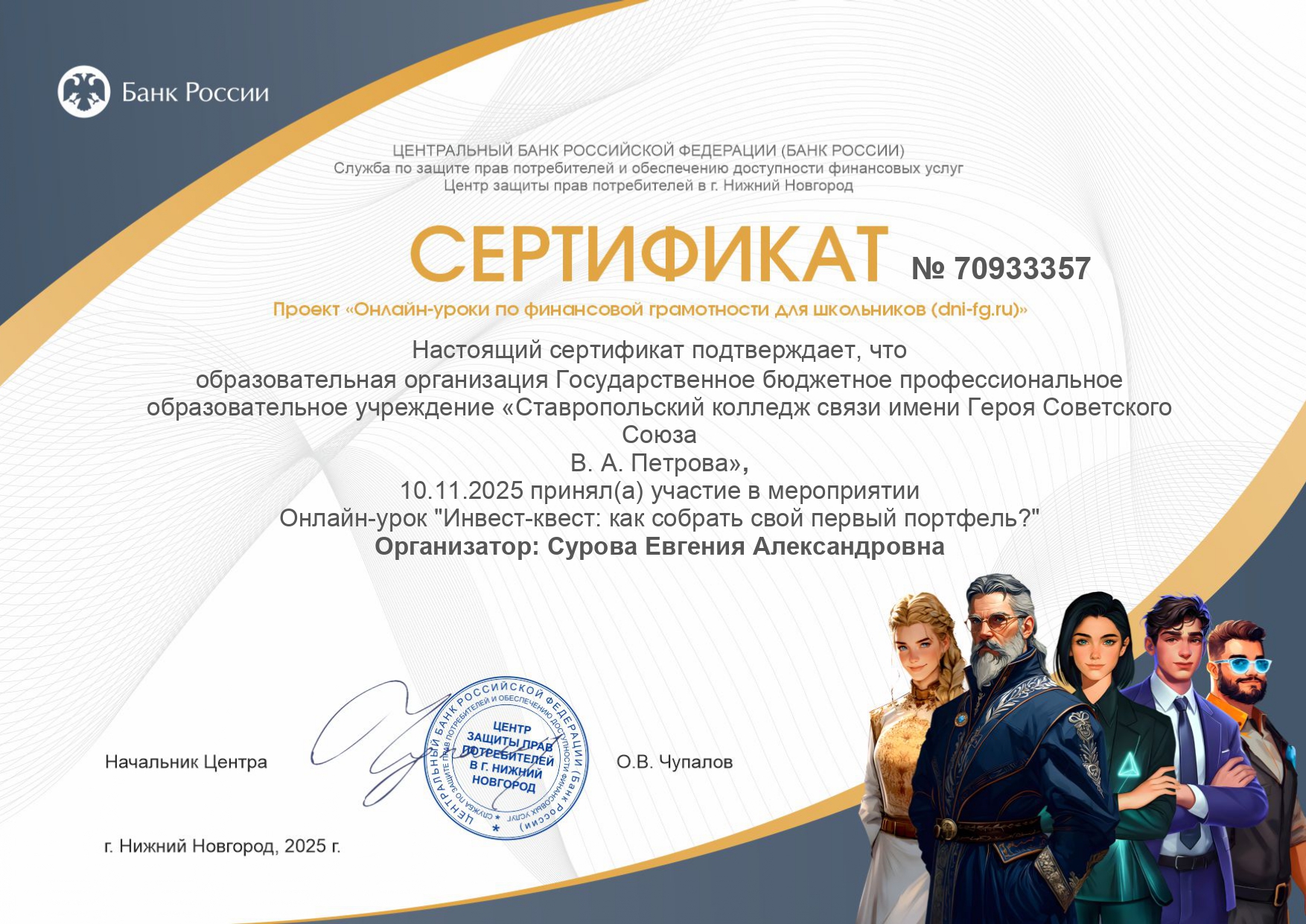 В рамках проекта Банка России «Онлайн-уроки финансовой грамотности» 10 ноября 2025 года студенты групп ИКС 243 с классным руководителем Евгенией Александровной Суровой приняли участие в онлайн-уроке на тему: «Инвест-квест: как собрать свой первый портфель?».