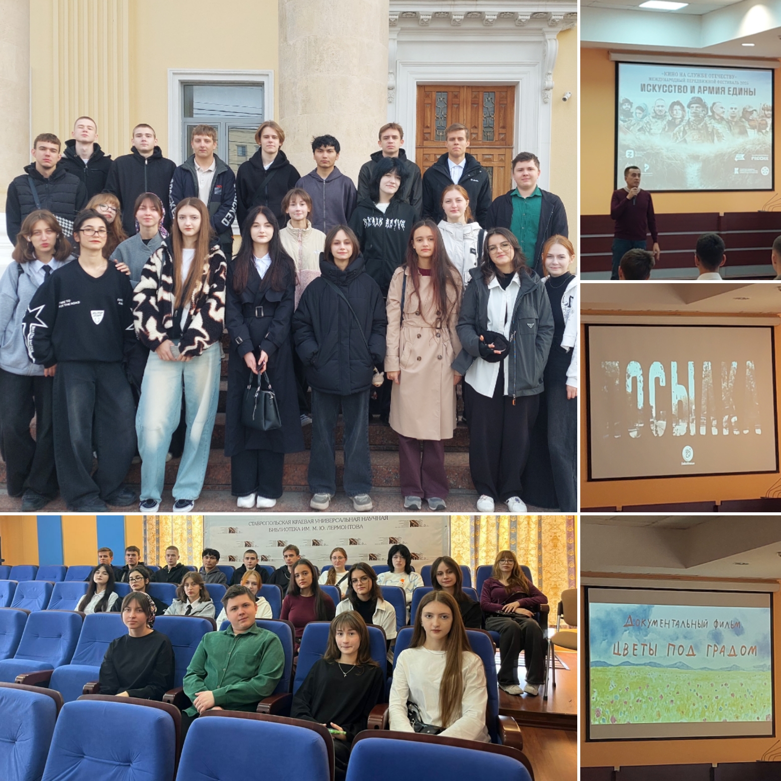 17 октября 2025 года в рамках Международного передвижного фестиваля «Кино на службе Отечеству» студенты групп РЭУ-243 и ИВ-244 стали гостями Ставропольской краевой библиотеки им. М. Ю. Лермонтова. В стенах библиотеки состоялся показ короткометражных художественных фильмов, посвященных специальной военной операции: «Окопная свеча», «Посылка», «Цветы под градом».