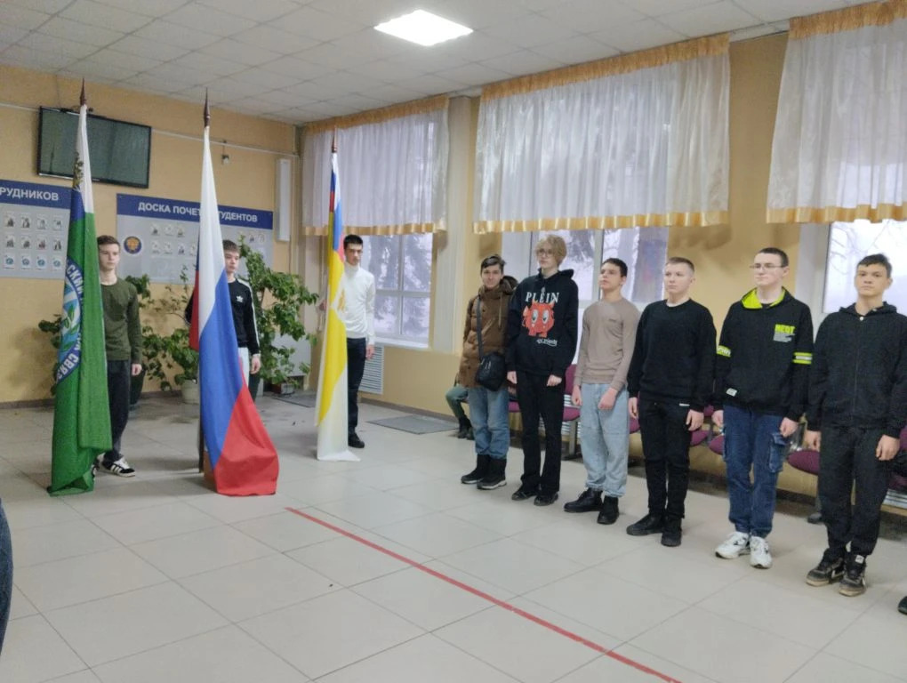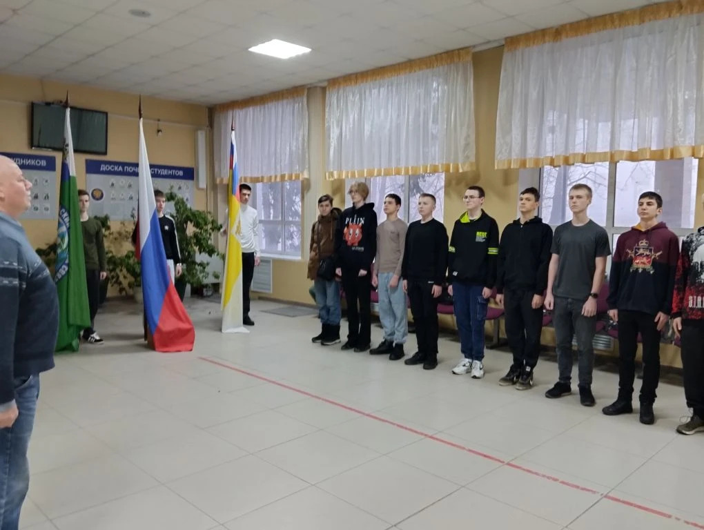 Утро понедельника, 2 февраля 2026 года, в нашем колледже началось с торжественного подъема Государственного флага Российской Федерации и исполнения гимна страны. Это почетное право было предоставлено студентам группы ИКС 252.