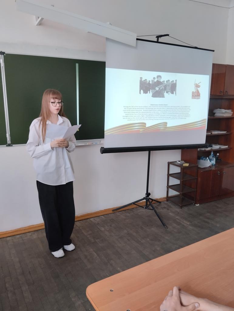 В преддверии празднования 80-летия Победы в ВОВ преподаватели Бессараб М. А., Кривцова С. Н. и студенты групп И В 244, РАЗ 242, Р 232, ИКС 232 подготовили и провели классный час на тему «Неизвестные герои ВОВ». В презентации были представлены документальные киносъёмки, фото, песни военных лет. Мероприятия проводилось на двух языках: русском и английском. «Гости из разных англоязычных стран» в исполнении студентов рассказали на английском языке о неизвестных юных и взрослых героя ВОВ, о которых многие из нас не слышали раньше. Преподаватели выступали в качестве переводчиков.