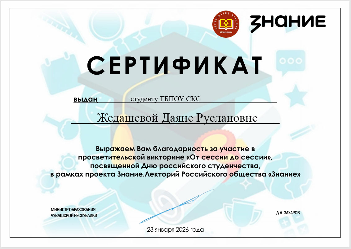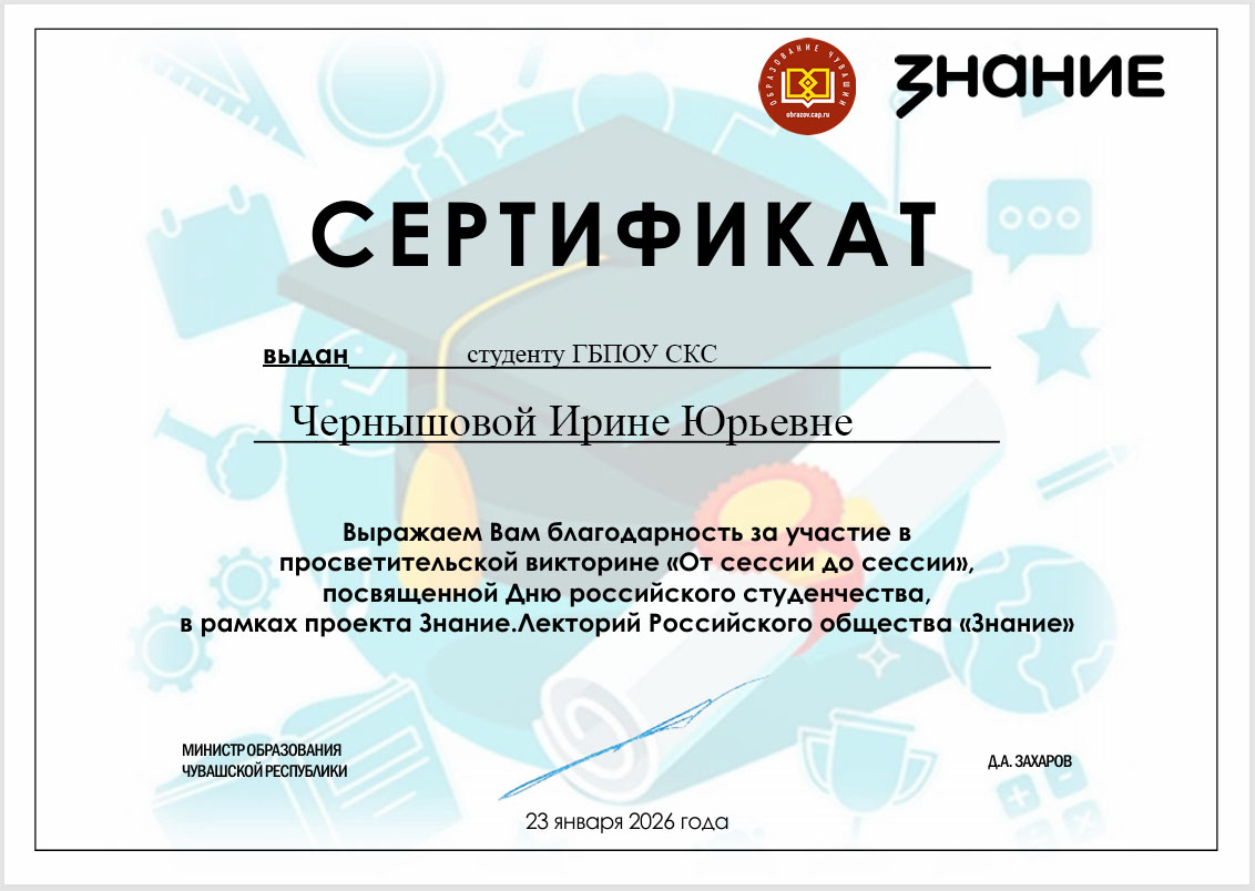 23 января, накануне Дня российского студенчества, студенты групп    ИВ 244, ИП 245, ИП 246 вместе со своими наставниками – преподавателями Ириной Владимировной Ерёминой и Светланой Владимировной Романенко – приняли активное участие в просветительской викторине «От сессии до сессии». Мероприятие прошло в рамках масштабного федерального проекта «Знание», главная цель которого – популяризация науки и культуры среди молодежи.