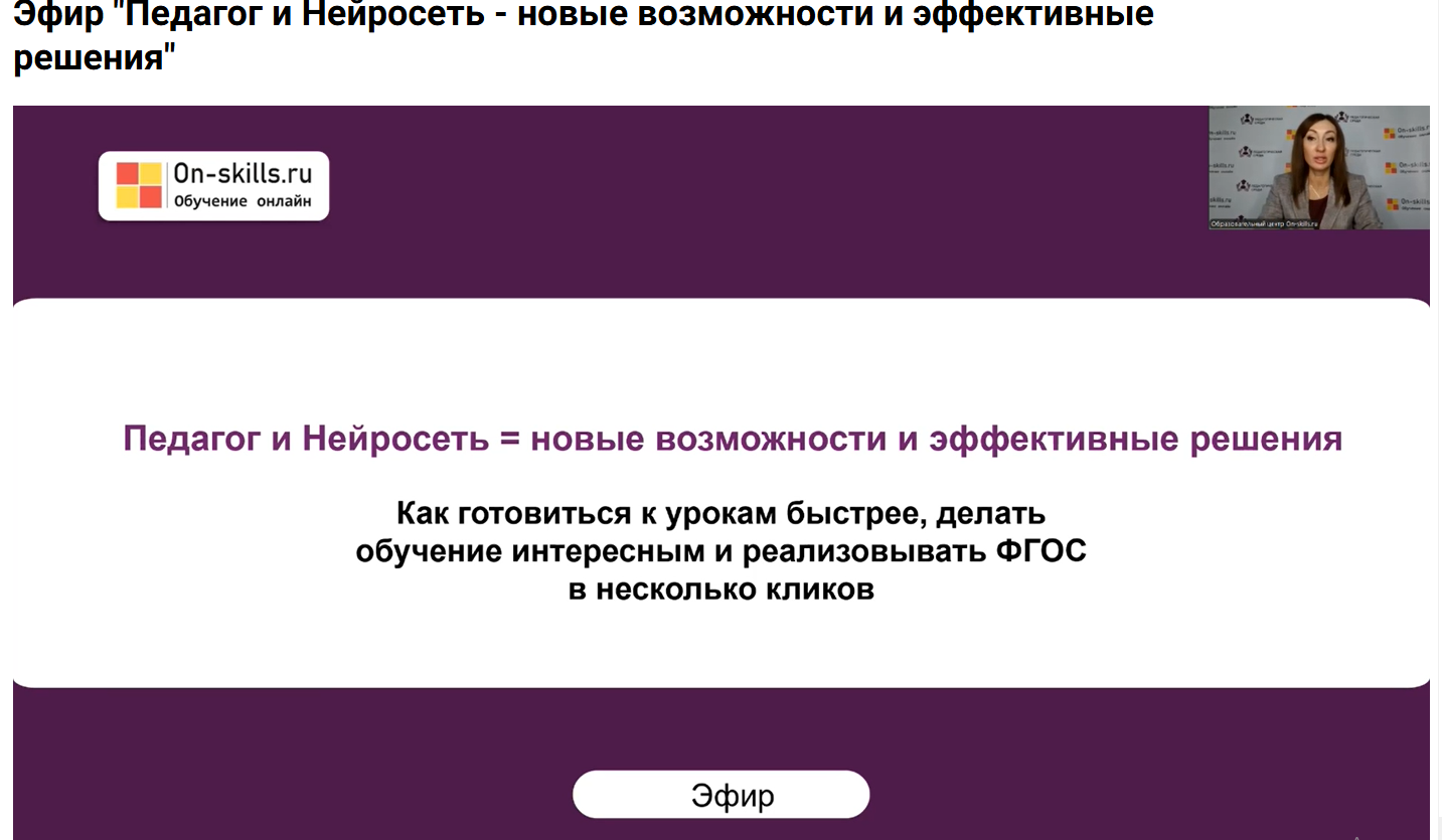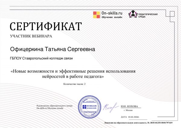 3 февраля 2026 г. Т. С. Офицеркина приняла активное участие в вебинаре «Педагог и нейросеть – новые возможности и эффективные решения» на платформе образовательного проекта On-skills.ru. Этот вебинар стал важным шагом на пути к внедрению передовых технологий в образовательный процесс.
