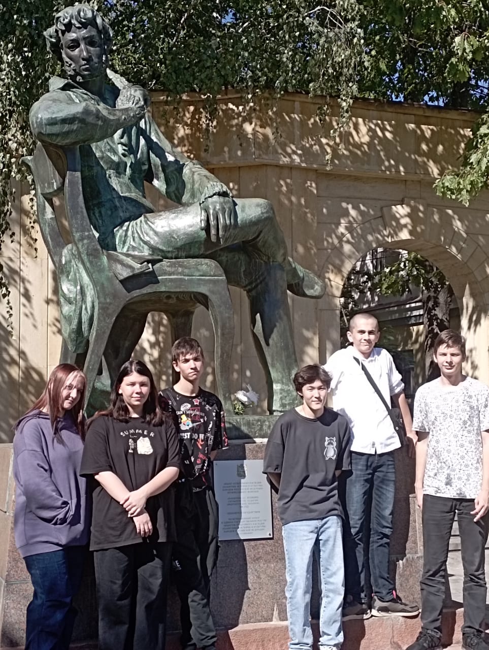 Закончилась наша экскурсия под сенью все еще зеленных берез у памятника великого поэта. Памятник А. С. Пушкину находится на проспекте Карла Маркса, с южной стороны Крепостной горы, напротив бывшей почтовой станции, где когда-то Александр Сергеевич отмечал свою подорожную. Памятник был установлен в 1987 году в честь 150-летия со дня гибели великого поэта.