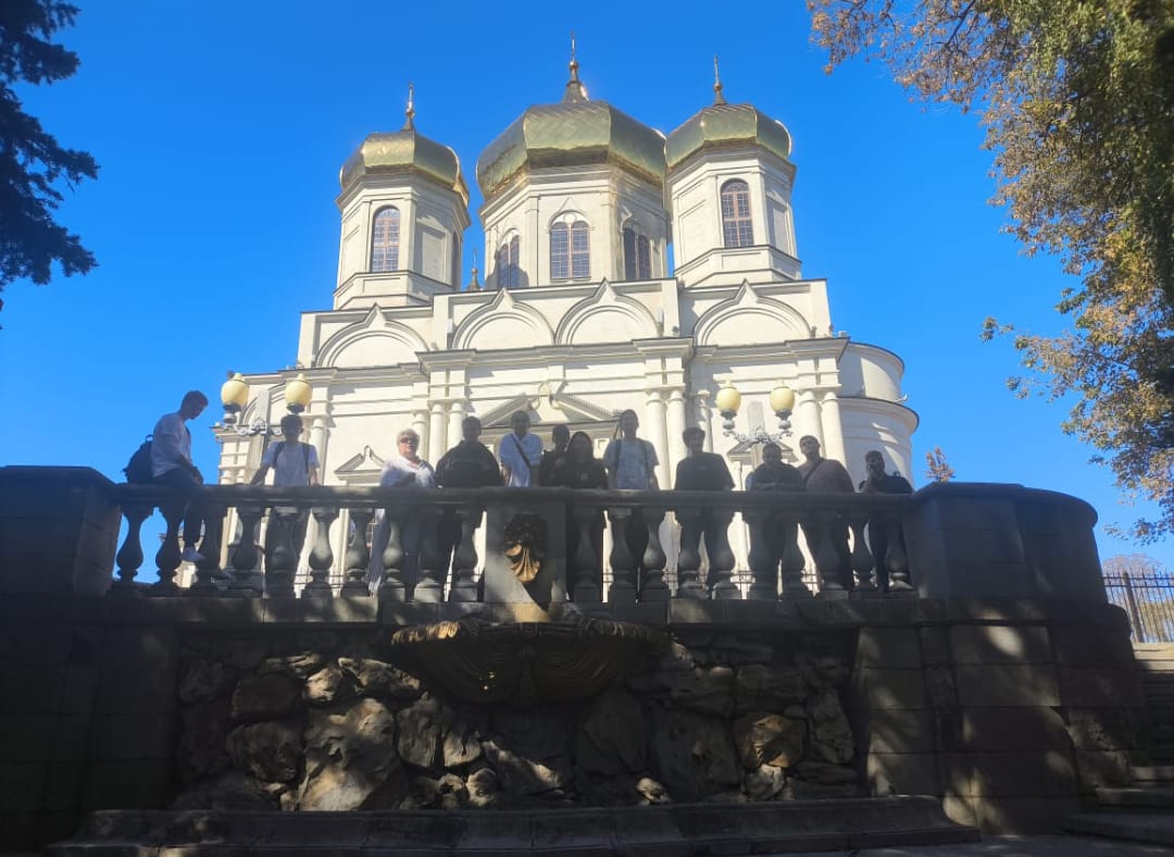 Немного ниже расположено самое высокое здание – Казанский кафедральный собор Ставрополя, высота которого с куполом достигает 78 метров. Здание поражает своей красотой и величием. По сохранившейся от храмового комплекса XIX века каскадной лестнице спустились к Мемориалу Славы и Вечному огню.