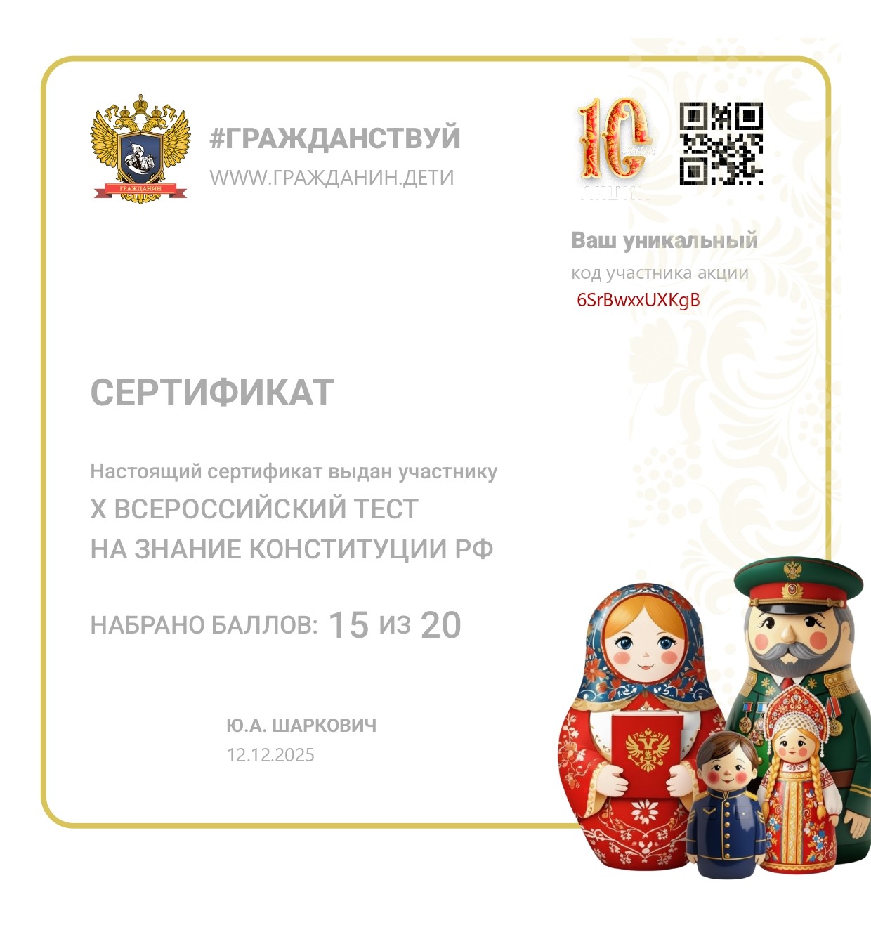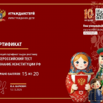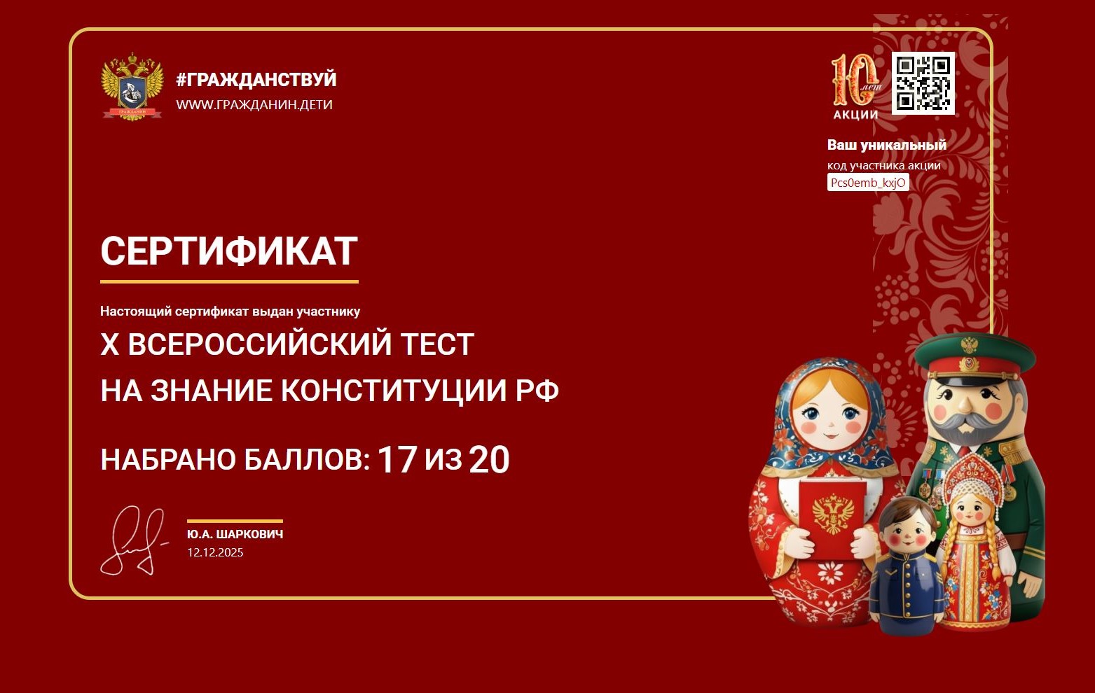 Ежегодно 12 декабря, в День Конституции Российской Федерации, Всероссийское общественное движение «Гражданин» организует масштабную акцию «Всероссийский тест на знание Конституции РФ». Этот год особенный — акция отмечает свой юбилей, десятый раз объединяя граждан по всей стране. В 2025 году она стала символом десятилетия усилий по повышению правовой культуры и гражданского самосознания.