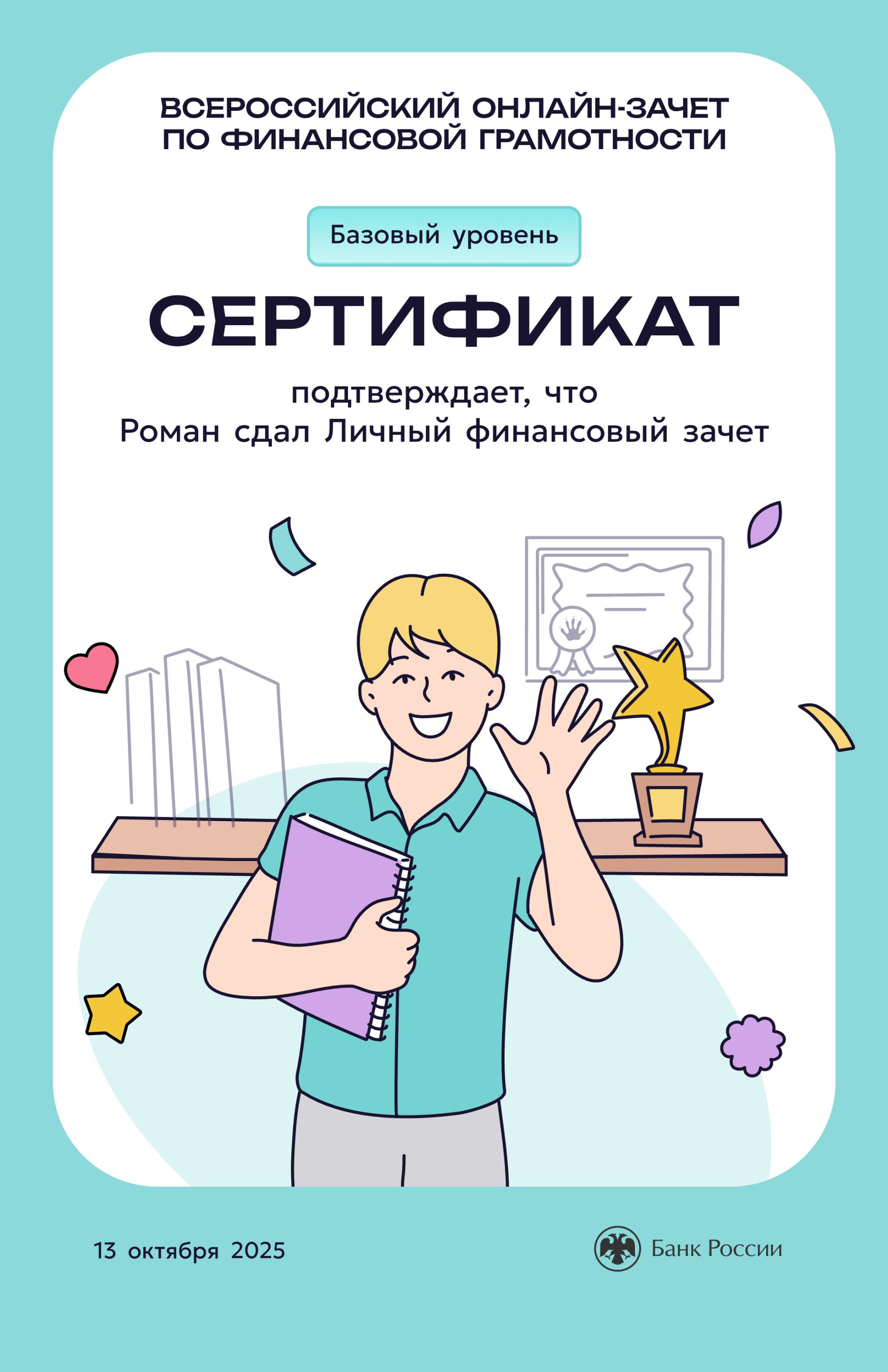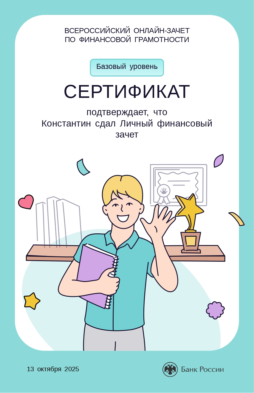 Каждый участник, успешно справившийся с заданиями, получил персональный сертификат, подтверждающий его уровень финансовой грамотности. Этот документ может стать ценной строчкой в портфолио молодого специалиста.