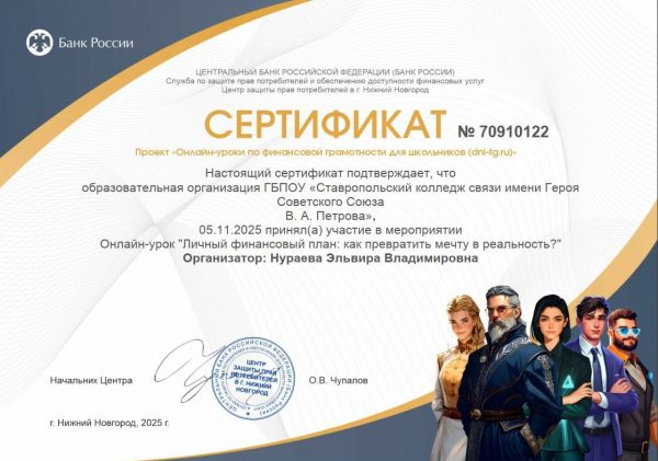 5 ноября 2025 года студенты ГБПОУ «Ставропольский колледж связи имени Героя Советского Союза В. А. Петрова» под руководством классного руководителя приняли участие в образовательном онлайн-мероприятии «Личный финансовый план: как превратить мечту в реальность?».
