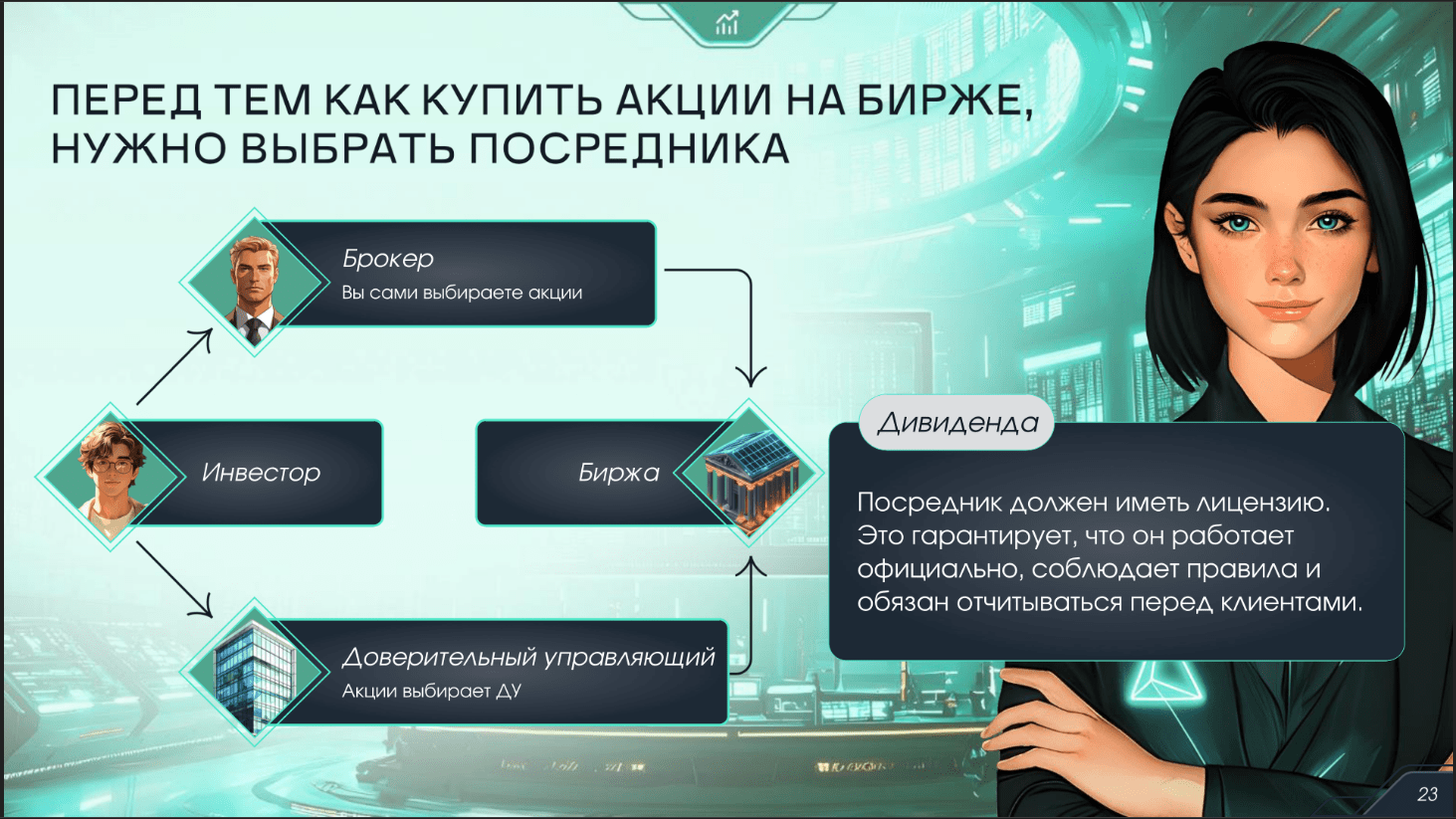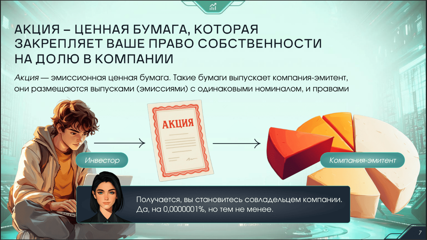Тема урока — «Акции: как стать совладельцем компании?» — была направлена на формирование у обучающихся базовых знаний о фондовых рынках, принципах функционирования акционерного капитала и возможностях участия в экономике через инвестиции. В доступной и интерактивной форме студенты узнали: