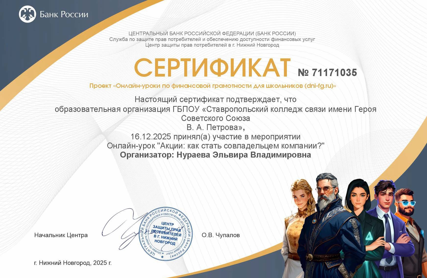 Студенты групп ИП 255 и ИКС 251 ГБПОУ «Ставропольский колледж связи имени Героя Советского Союза В. А. Петрова» приняли участие в онлайн-уроке в рамках Всероссийского проекта, организованного Центральным банком Российской Федерации.