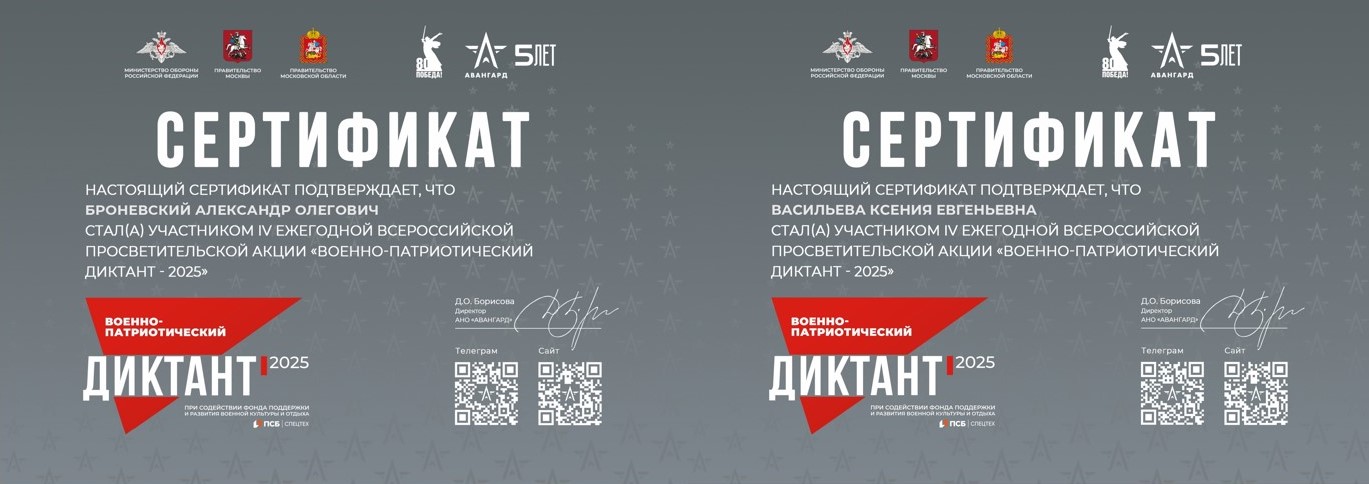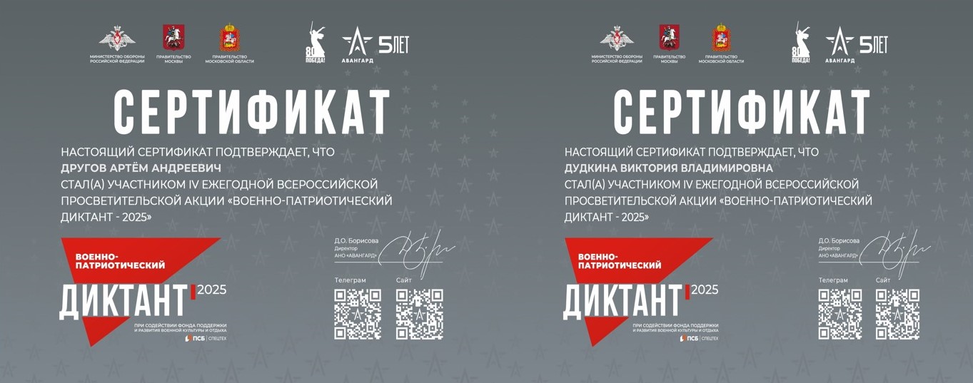 1 декабря 2025 года состоялась IV ежегодная всероссийская акция «Военно-патриотический диктант-2025», объединившая студентов и педагогов из разных уголков страны. В мероприятии приняли участие студенты групп ИП 232, ИВ 234 и ИВ 244 нашего колледжа, а также их классные руководители Т. С. Офицеркина и В. В. Дудкина.