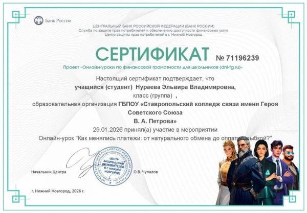 В рамках всероссийского проекта «Онлайн-занятия по финансовой грамотности» студенты групп ИП 252 и ИКС 251 Ставропольского колледжа связи имени Героя Советского Союза В. А. Петрова приняли участие в познавательном онлайн-уроке «Как менялись платежи: от натурального обмена до оплаты улыбкой?».