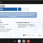 На вебинаре обсудили актуальные проблемы межэтнических отношений в России, укрепление гражданского единства и формирование культуры межэтнического общения в поликультурной среде, вопросы укрепления общероссийского гражданского единства в современных геополитических условиях, межкультурный диалог как необходимый инструмент профилактики экстремизма и терроризма в образовательной среде.