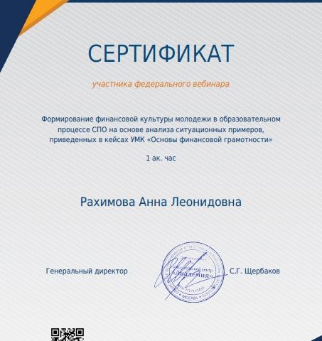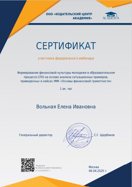 В современном мире финансовая грамотность становится неотъемлемой частью образования, ведь умение управлять личными финансами и принимать обоснованные экономические решения важно для каждого человека. В целях повышения уровня финансовой осведомлённости и профессионального развития преподаватели Вольная Е.И., Лукьянова С.П., Степаненко О.А., Рахимова А.Л. и Нураева Э.В. приняли участие в обучающем вебинаре на тему «Формирование финансовой культуры молодежи в образовательном процессе СПО на основе анализа ситуационных примеров, приведенных в кейсах УМК «Основы финансовой грамотности».